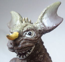 バラゴンは 人間も食べる恐ろしい怪獣ですが、 そんな野蛮な感じが、 顔の表情によく出てますね。 原型士の人、天才だなぁ・・・。 |