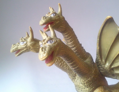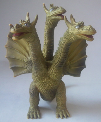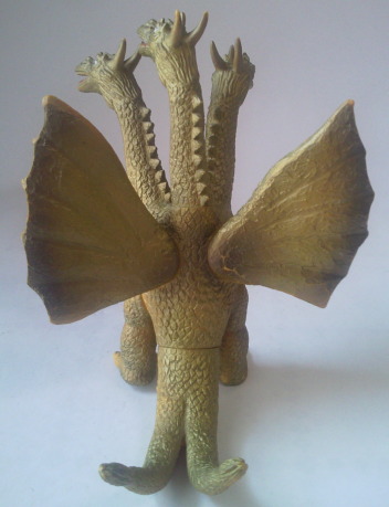 キングギドラ 全長約17センチ。 『地球攻撃命令 ゴジラ対ガイガン』や『流星人間ゾーン』に 登場したキングギドラ (経年劣化した着ぐるみを部分的に改修した、 俗に言う “2代目キングギドラ”) を彷彿とさせる、 なんだかヨレヨレ感がある造形ですが、 そこまでマニアックなものを商品化する時代でもなかったはずなので、 たぶん、 リアル造形にする技術がまだ未熟だったがゆえ、 偶然出来上がってしまった産物ではないか、と思われます。 |