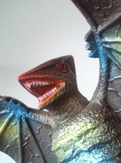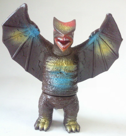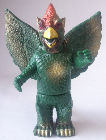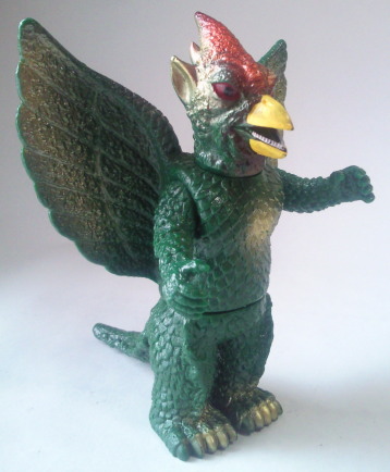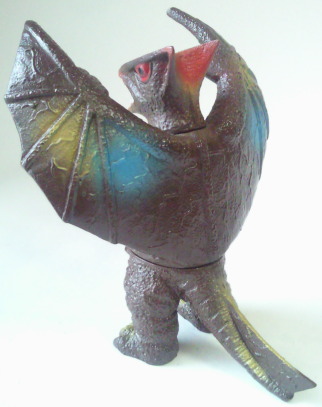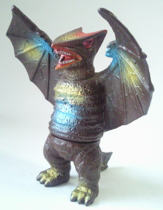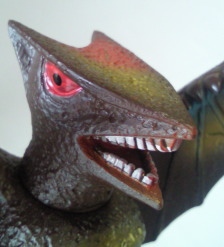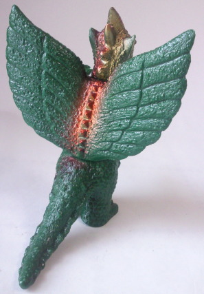 | ギャオスは、 超音波メスで何でも切断してしまう恐ろしい怪獣ですが、 その鋭利な個性を、 この人形は、 鮮やかなメタリック塗装と 羽根を上に向けて威嚇しているようなポーズで、派手に主張しています。 |