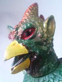 | さらわれた我が子を取り戻しにきたガッパの、 その悲壮な覚悟や燃えたぎる怒りをソフビ人形で表すには、 やっぱ、この赤い目が最も効果的。 時代が変わっても、 そうやって、 ガッパの核となる部分はしっかりと押さえてあるところに、 好感が持てます。 |