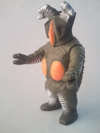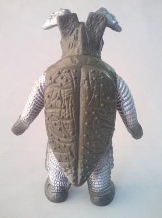 ブルマァク製、全長約13センチ。 以前、 第38回 「Z-TON ~ウルトラマンが敗れた日~」の中でも チラッと紹介しましたが、 なんとも不格好な怪獣人形です。 でも、 それは、人形の造形のせいではありません。 実物の着ぐるみが不出来だったから、なのです。 昭和40年代後半のブルマァクが、 ピークを迎えていたその優れた造形力で、着ぐるみに似せて作った結果、 こうなったのです。 カッコ悪いけど、リアルなカッコいいソフビ、というわけです(笑)。 |