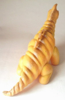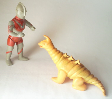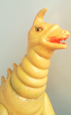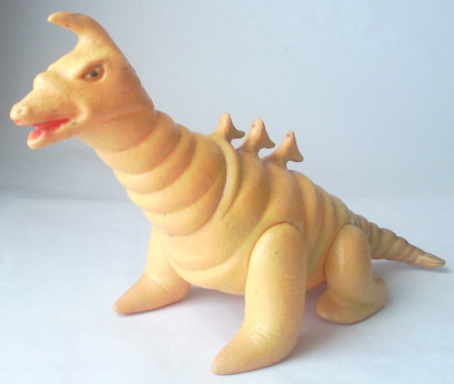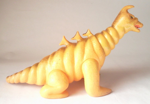 | このソフビは、 昭和40年代半ばに発売された商品で、 “いかにも怪獣のオモチャ” って感じがして、僕は好きなンです。 なんといっても、 実物の着ぐるみの イモムシのような体節の繰り返しを、 らせん状に巻いた形で表現する、という造形アイデアが秀逸。 そのユニークな形状に、 甘い匂いがしてきそうなこってりとした黄色のカラーリングも相まって、 ずっと触って遊んでると、 なんだかコルネパンを手に持ってるような錯覚に陥り、 パクッとかぶりつきたい衝動にかられます(笑)。 |
