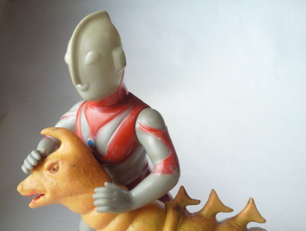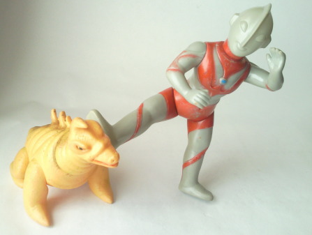 | けど、冗談ではなくて、 そんなふうに 実物の怪獣とは直接関係無いところでもイメージが膨らむのが、昔の怪獣ソフビの醍醐味なンですよね。 そして、 自由に空想する事の面白さを子供たちに伝えているその醍醐味こそ、オモチャの本領。 オモチャは夢を育むものですからね。 それが、 “怪獣” という、ファンタジーの世界の生き物の人形ならば、尚更です。 造形もカラーリングも着ぐるみに忠実でない分、 実物のゴルドンの再現率は、 当然の事ながら100%を下回りますが、 ゴルドンという怪獣の魅力は、120%表現されています。 素敵な事だと思います。 |