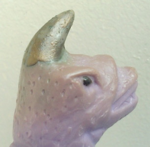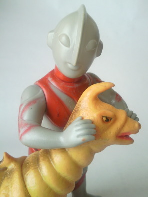 ・・・が、 乗りかかった船で とことん擁護させていただくと(笑)、 四足歩行の怪獣でも、 ウルトラマンと格闘中には一瞬こんな体勢になる事もあるだろうし、 体色も、 地底の暗闇の中では、こんな色に見える事もあるかもしれませんので、 劇中のイメージは崩壊していないンです。 え? ウルトラマンと格闘したのは 地底じゃなくて地上でだったじゃないか、って? う~ん、じゃあ・・・、 そうだ! 色なんか何色だっていいンですよ、実は。 ゴルドン人形に限らず、オモチャ屋さんに並んでいたソフビ怪獣人形は全て、 僕ら子供たちには キラキラ輝いて黄金色のように見えていたンですから。 ・・・ダメ? こんなの(笑)。 あ、でも、 角には、 実物に忠実な、黄金色の塗装が施されていたようです。 ただ、 経年による顔料の銅成分の酸化によって変色しているし、 塗装自体がだいぶ剥がれてしまっているので、判りづらいですけどね。 |
