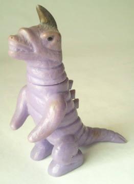 | こちらは、 同じくブルマァク製で、 全長約10センチのミニサイズソフビ。 “コルネパン” と言えど、 なるべく実物のゴルドンのイメージを壊さぬよう、 その形も色も、 最低限の配慮はされていたと思われるスタンダードサイズの人形と異なり、 このミニゴルドンは、 後ろ足だけで立っちゃてる造形といい、 全身紫色のカラーリングといい、 実物の特徴をほとんど無視した仕上がりとなっています。 |