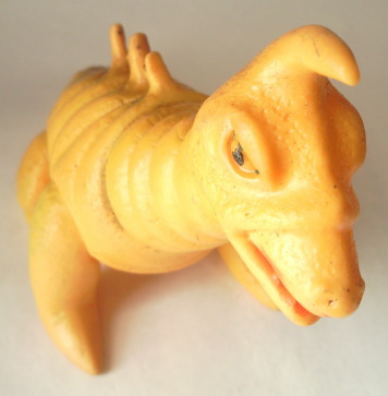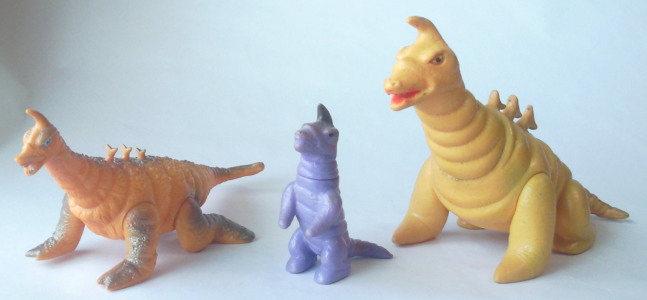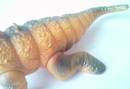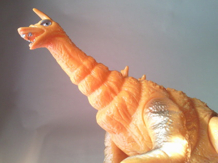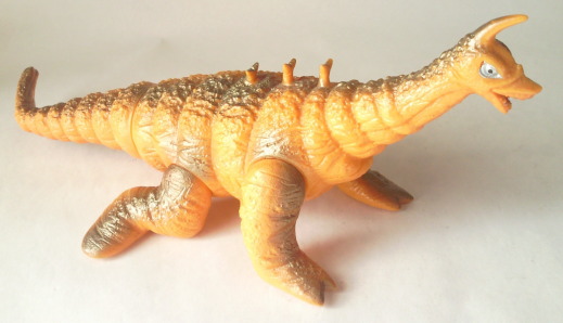 | 首や脚に見られるシワが、 生き物としてのシワではなく、着ぐるみのシワを意識して表現されているし、 黄金色も、 全身ではありませんが、効果的に吹きつけてあり、 “実物の再現” をめざす、 新時代のソフビ人形のコンセプトが窺い知れます。 先述の、 “いかにも怪獣のオモチャ” なブルマァクのゴルドン人形とは 対照的なソフビ、と言えますね。 コルネパンゴルドンや二本足で立ってる紫ゴルドンのデフォルメを 散々称賛した手前、 このリアルでカッコいいゴルドン人形には否定的でなければ 矛盾してしまうかもしれませんが、 これまでこの『ソフビ大好き!』を読んできて下さった方なら御存知のとおり、 こっちも大好きなンですよねぇ、僕。 |