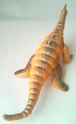 | これは、 ポピー製 キングザウルスシリーズ、全長約23センチ。 昭和50年代半ばに発売されたソフビですが、 現在でも充分通用するリアル造形。 60種以上あるキングザウルスシリーズの怪獣人形の中でも 1、2位を争う、カッコよさではないでしょうか。 |