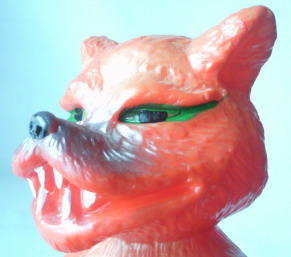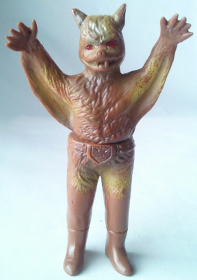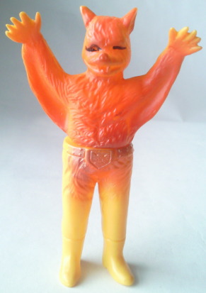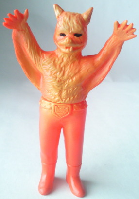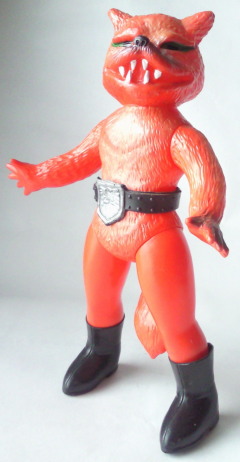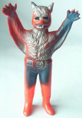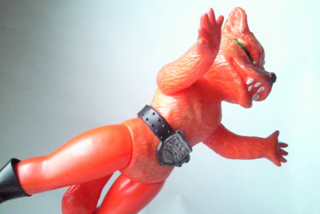 | バンダイ製 ミニサイズ、全長約11センチ。 茶色の成形色に黄色を吹いたり、 黄色の成形色にオレンジ色を吹いたり、 赤の成形色に、 紺色と銀色を吹いたり、黄色を吹いたり・・・、と なんか、 色で、メーカー側が自由に遊んでいるよう。 また、 下半身も、 獣毛が、 モールドしてあるものと モールドしてないものがあり、 集め甲斐があるし、 ほかにもまだ バージョン違いがありそうな気もして、 怪人ミニソフビの真骨頂、といった感じです。 |