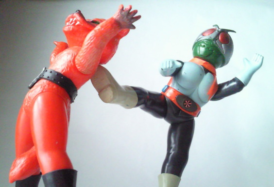 | ムササビードルは、 皮膜を広げて滑空する際、 真空状態を生むスリップ・ストリーム現象を誘発し、 それによって近くにいる人間の内臓を破裂させる恐ろしい怪人ですが、 それよりも、 僕がこの怪人でいちばん印象に残っているは、 正面から喰らうのが常のライダーキックを 空中で背中に浴びて果てた、あの、なんだか無様な最期。 |