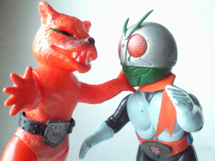 | 『仮面ライダー』に登場したムササビの怪人。 ムササビを化け物だと人間が勝手に思い込んだ野衾と異なり、 こちらは、 ショッカー科学陣の改造手術によって生み出された、 正真正銘の(笑)、ムササビの化け物です。 |