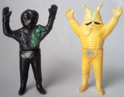 | 先月の中頃、 朝日新聞に掲載された或る投稿が発端となり、 ネット上で、 喪服で飲食店に入るのはマナー違反か? という議論が巻き起こりました。 投稿の内容は、 投稿者(70代の男性)が、 親族の告別式が終わった後、 喪服姿のまま、 近くの寿司屋に立ち寄ったところ、 店長から異様な視線を向けられ、 不審に思いながらも食事を終えて店を出た途端、 店内から、 「塩をまいておけ!」 と、その店長が怒鳴っている声が聞こえた、 というもの。 ・・・何なのでしょう? こんな寿司屋、本当にあるンでしょうか? 信じられません。 寿司屋の店長ともあろう人が “通夜振る舞い” や “精進落とし” を知らないはずがないので、 喪服を着た客が寿司屋でこんな目に遭うなんて、 常識では考えられない事です。 ってか、 来店客に対して、 睨みつけたり、怒鳴り声をわざと聞かせたり、塩をまいたり・・・、 そんなの、 客商売として、そもそもありえません。 『ドリフ大爆笑』の “もしものコーナー” じゃあるまいし、 実在する寿司屋の話とは、到底思えないのです。 投稿者の男性の思い違いじゃないンですかね? そうであってほしいです。 でも、 こんな寿司屋が現実に存在して、 投稿者の男性がされた事が事実なら、 天国のいかりや長介さんも、 下界を見下ろしながら、 「ダメだ、こりゃ」 と、本気でつぶやいた事でしょう。 ただ、 番組と違って 大爆笑とはならないどころか、誰一人として笑いません。 喪服姿で寿司屋に入ったら 店の人に嫌がられて塩をまかれた、 なんて話、洒落にはなりませんから。 嘆かわしいだけです。 でも、 なんと、驚く事に、 この寿司屋の店長の行為を、非としない人がいるンですよね。 冒頭で述べたように、 この投稿が発端となって 賛否両論の議論が巻き起こりましたので、 喪服姿で寿司屋に行った投稿者の方が悪い、 喪服姿で飲食店に行くなんてマナー違反だ、 と主張する人が、世の中に何人もいたわけです。 思わず、 「は?」 と声が出てしまいました。 もう、嘆かわしいのを通り越して、脱力してしまうような意見です。 マジで言ってるの? って思いました。 その人たちは、 喪服姿で飲食店に入ってはいけない、 なんて素っ頓狂なマナーを、 いったい、どこで誰から教わったのでしょうか? いや、仮に間違って教わったのだとしても、 ちょっと考えれば、 そんなマナーはおかしい、って自分自身で気づくはずですから、 そのまま信じ切っちゃってるのが、不思議。 理解不能です。 ネット上における匿名の意見ゆえ、 いたずら半分で無責任な事を言っているとしか思えません。 だって、 喪服姿は縁起が悪いので 店やほかの客に迷惑がかかる、 というのなら、 告別式の帰りに、 飲食店に入るのだけがNGじゃなくて、 コンビニに寄ってタバコやコーヒーなどを買うのも、 ガソリンスタンドで給油するのも、 バスや電車やタクシーに乗るのも、 何から何まで全部NG、 って事になるじゃありませんか。 自宅と告別式会場間の移動は テレポーテーションで行え、 とでもいうのでしょうか? 馬鹿馬鹿しい。 だいたい、 喪服を着た人を見かけたら、 あぁ、誰か亡くなったんだなぁ・・・、 って思って、 遺族や近親者の人たちの心痛を察し、 亡くなった人の冥福を祈り、心の中でそっと手を合わせるものでしょう。 それを、 縁起が悪いといって忌み嫌うなんて、 人としてどうなの? って思います。 その喪服の人にも、亡くなった人にも、失礼じゃありませんか。 自分の身内に不幸があった際に、 喪服を着ているから、と 他者から邪険にされたらどう思うか、 我が身に置き換えて考えれば解るはずです。 そもそも、 なぜ喪服を縁起が悪いと思うか、っていうと、 喪服を着た人と遭遇したら我が身に災いがふりかかると思ってる、からですよね? って事は、 見ず知らずの故人から祟られたり呪われたりする事を恐れてる、 って事ですから、 嘲笑してしまうほど低劣で歪んでますよ、死生観が。 幼稚すぎます。 人は、死んだら悪魔にでもなるンですか? 喪服を着てる人は、その悪魔の使いなンですか? いかりや長介さんでなくても、 「ダメだ、こりゃ」 って、つぶやきたくなります。 ・・・さて、 そんな悲憤慷慨の中ではありますが、コレクションの紹介であります。 実は、この投稿にまつわる一連のニュースを知った時、 パッと、2人の怪人が、 僕の頭に浮かンだのです。 なので、今回はその2怪人のソフビを紹介します。 |