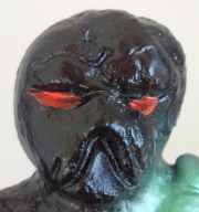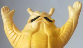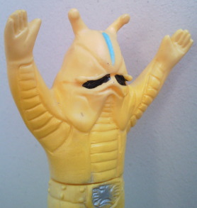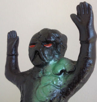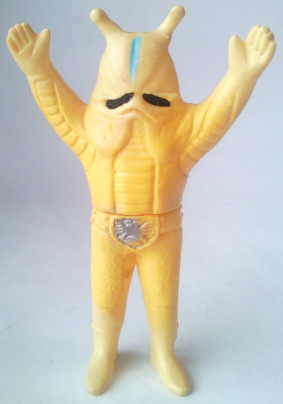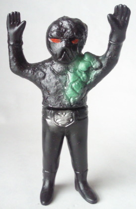 | まずは、こちら、 カビビンガ。 ポピー製、全長約12センチ。 『仮面ライダー』第44話「墓場の怪人カビビンガ」に登場した、カビの怪人です。 人間を養分にして育つ殺人カビを培養して町にばらまき、大混乱を起こす事が使命。 放映時の商品ですが、 顔の造形がテキトー過ぎて、 実物のカビビンガよりも不気味です(笑)。 |