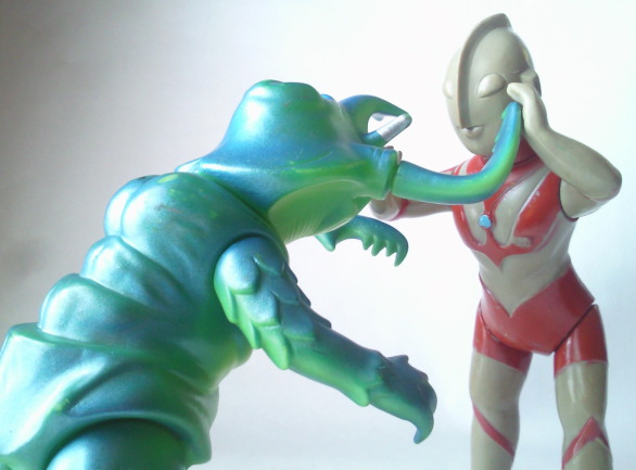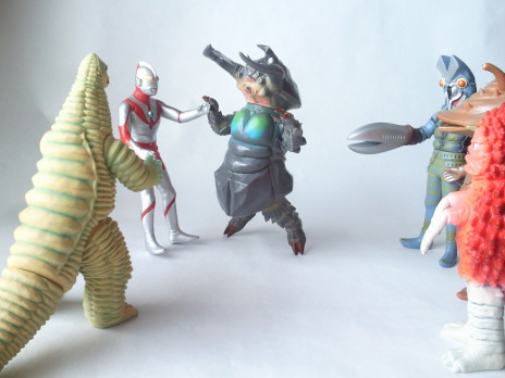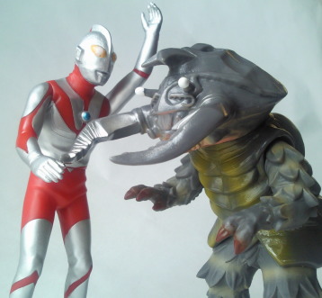 | 前から言おうと思っていたのですが、 僕のウィキペディアを書いて下さった方(方々?)、どうもありがとうございます。 とても嬉しいです。 出来てる事を知ったのは2、3年前ですが、 いまだに、 パソコンの画面に出して記述を眺めては、 幸せだなぁ・・・、 と、感慨深く、美味しいビールを飲んでます(笑)。 ・・・え? どんだけ自分が好きなんだ!? って? ハハハ。 ・・・だってさぁ、 “俳優” っていったって、 べつにそれで食えてるわけではないし、誰も知らないし、 実情は、 サラリーマン生活をドロップアウトしてアルバイトで生計を立てている、ただの冴えないオッサンですからねぇ。 それが “ウィキペディア” て・・・。 しかも、 なんか、めっちゃカッコよく書いてあるし、アレ。 若干の気恥ずかしさはありますけど、 少なくとも、 書いて下さった方は僕を応援して下さっているわけですから、 嬉しいですよ、そりゃあ。 辛い事や悔しい事があっても頑張ろっ、 って気になりますもん。 ありがたい事です、本当に。 どこのどなたか、は存じませんが、 記述内容からして、 この『ソフビ大好き!』を読んで下さっている方だと思いますので、 この場を借りて、熱くお礼を言わせて頂きます。 ってか、 僕についてあんなに詳しく知っているのは、 たぶん『セーラーファイト!』のファンの方か関係者の方だと思うので、 もしかしたら、 どこのどなたか存じているかもしれませんけどね。 だとしたら、誰だろうなぁ・・・??? そういえば、以前、 『セーラーファイト!』の監督である喜井竜児さんに、 「僕のウィキペディア書いてくれたの、もしかして、喜井さん?」 って聞いた事があるのですが、 「なんで俺がそんな面倒くさい事しなかんの?」 と鼻で笑われました。 ごもっとも、でございます(汗)。 親しい知人でも面倒くさいと思うような事なのですから、 やはり、感謝、感謝です。 本当にありがとうございます。 さて、 今回、そんなウィキペディアのお礼のほかに、 もうひとつ、 僕のプロフィールに関して、述べたい事があります。 それは、“誕生日” について。 僕の誕生日は、7月10日。 これ、 特撮の神様・円谷英二さんの、戸籍上の誕生日と同じなンですよね。 この『ソフビ大好き!』でも以前述べましたし、 特撮ファンの人と話す際には、 自慢したり、話のきっかけにしたり、なにかと重宝しているネタなのですが、 先日、 アルバイト先にいる特撮ファンの人から、 「もっと単純に、“ウルトラマンの日” って言った方が、 わかりやすくてカッコいいよ」 とアドバイス(笑)されました。 そうなンですよね。 いつ制定されたのか知りませんけど、 “7月10日” って、“ウルトラマンの日” なンです。 昭和41年の7月17日に 記念すべき第1話が放送された『ウルトラマン』ですが、 実は、 その1週間前の7月10日に、 『ウルトラマン前夜祭 ウルトラマン誕生』という番組が 放送されているンです(まぁ、特撮ファンの方なら御存知でしょうけど・・・)。 番組の内容は、 杉並公会堂で開催されたイベントの公開録画中継で、 ウルトラマンと バルタン星人やレッドキングなどの怪獣軍団、 そして科学特捜隊のメンバーや、なんと円谷英二さんまでもが 舞台に上がって、 次週から始まる新番組『ウルトラマン』のPRをするものでした。 つまり、 テレビ画面に初めてウルトラマンが現れた日、それが7月10日。 ゆえに、 “7月10日” が “ウルトラマンの日” に制定されたというわけなのです。 ・・・いやぁ、嬉しいですよね、これは。 ウルトラマン世代で、 ウルトラマンや怪獣が大好きで、 ウルトラマンや怪獣のオモチャの蒐集に 人生の大半の日々を捧げてしまっている僕の誕生日が、“ウルトラマンの日” だなんて・・・。 もちろん、 ただの偶然ですし、 「だから何なンだ?」 「それがどーした?」 ってツッコミを入れられる事必至の話なンですけど、 やっぱ、嬉しいものですよ。 ・・・あ、 僕のウィキペディア書いて下さった方、 誕生日が “ウルトラマンの日” である、 って記述、 追加しといてくれないかなぁ・・・(笑)。 今回は、 そんなわけで、“ウルトラマンの日” に曰くのある、この怪獣をピックアップ。 |