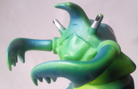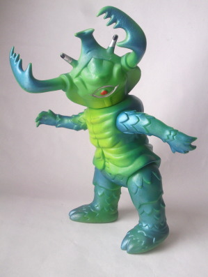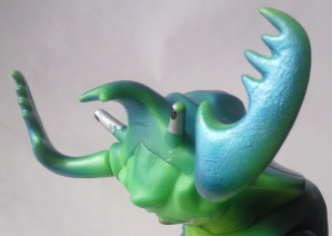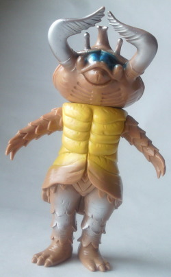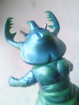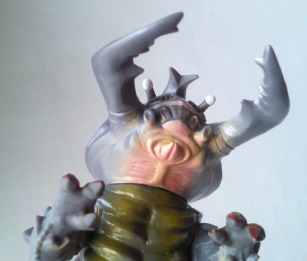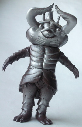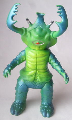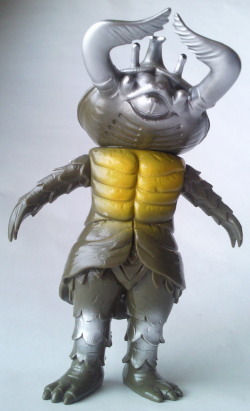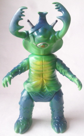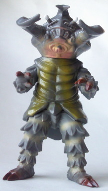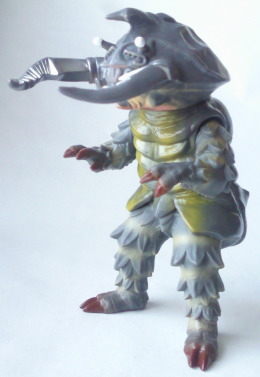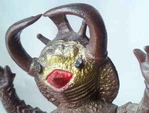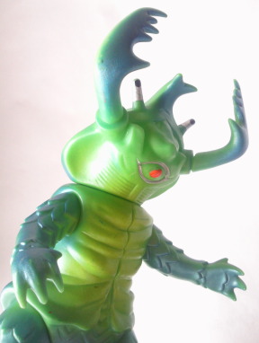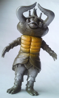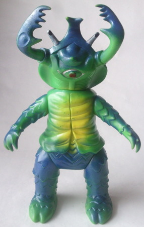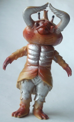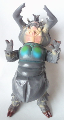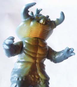 | 同じくマルサンの、追加生産分(2期)の人形です。全長約23センチ。 胸部に黄色の塗装が加わってます。 右のアゴに製造過程で出来てしまった円形の凹みがありますが、 これも、また “味”。 |