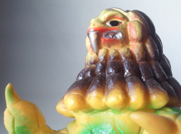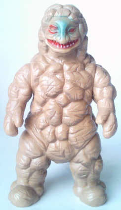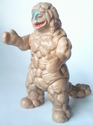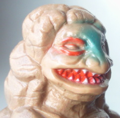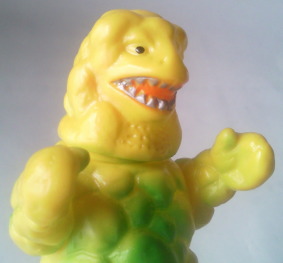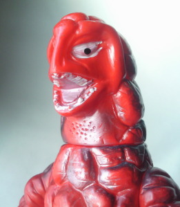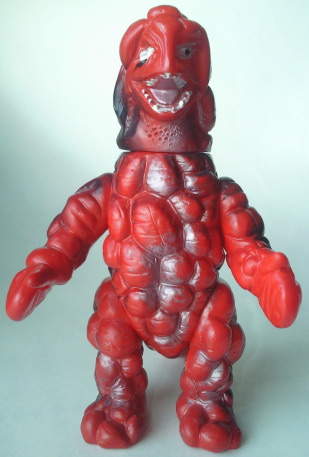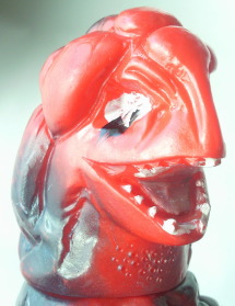 マルサンのソフビのような大胆なデフォルメは施さず、 劇中の、片目を傷つけられた状態を再現したり、 首の部分にある着ぐるみの覗き穴を再現したり、 極力、実物の姿形に近づけようと造形されていますが、 カラーリングが実物とは全く異なるので、 あまりリアルな印象は受けません。 でも、 実物の体色とは全く異なるこの深い赤の成型色こそが、 実は、この人形のいちばんの魅力なンですよね。 |