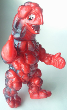 マルサンの時代が終わり、 ソフビ怪獣人形の造形や色を 実物の怪獣の外形に只々完璧に似せる時代に 少しずつ向かっていきながらも、 まだまだ “オモチャの夢” が生きていて、 それを手にして遊ぶ子供たちの感受性に その人形の価値を委ねている、 そんな、 当時のブルマァクの 玩具メーカーとしての認識が伺える、 絶妙な “赤” だと思います。 |