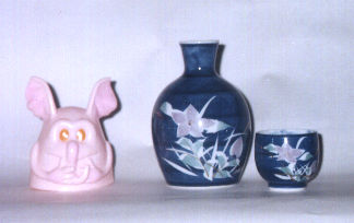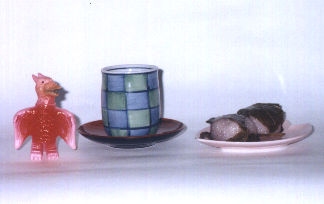お酒が苦手な人には、 お茶と甘いお菓子を。 隣りに添えたラドンのミニ人形が 「ホーホケキョ」と鳴いたら、 桜餅よりも梅羊羹の方が合うかな。 |