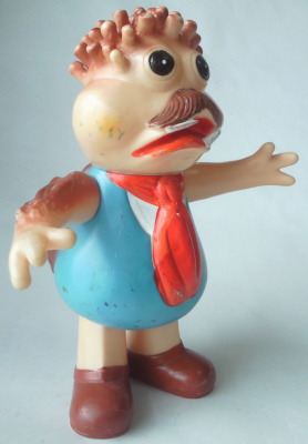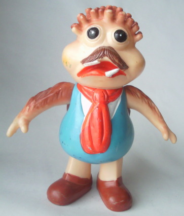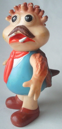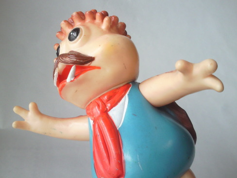| ブルマァク製、全長約21センチ。 このソフビは、 雑で無責任な造形ゆえ、実物にあまり似ておらず、 お世辞にも素晴らしいとは言えない仕上がりでありますが、 僕は、それを、 単なる “残念な出来” としては、片づけられないンですよねぇ・・・。 前述した、 ハッタル家に対する屈折した感情や横恋慕、といったゴルバ自身の心の葛藤が、 分身である人形を こんな捨て鉢な表現に導いた気もして、なんだか“味わい” を感じてしまうのです。 |