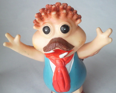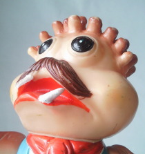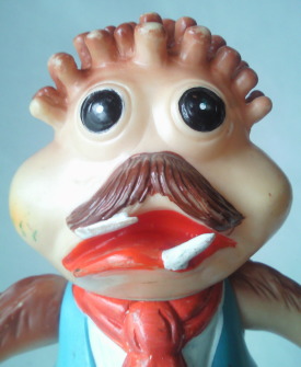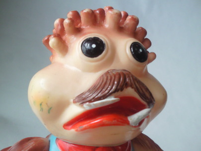 | なんといっても、 この、 悲劇に直面して呆然としているような、 世にも哀れな顔の表情が堪りません。 白目の部分も黒で塗りつぶしちゃってる目は、 なんだか涙を浮べているように見えますし、 上の歯(牙)の、 “真横” という、ありえない向きや、 微妙にズレて、口じゃない位置から生えちゃってる様なんて、 まるで、荒んでヤケクソになってる心情を表すかのようで、 「その苦しみや痛み、 子供の頃、解ってあげられなくて、ごめんねーっ!」 って、人形を抱きしめてあげたくなってしまうのです。 |
