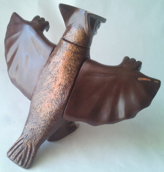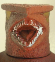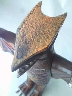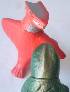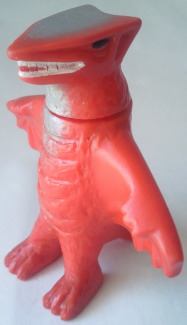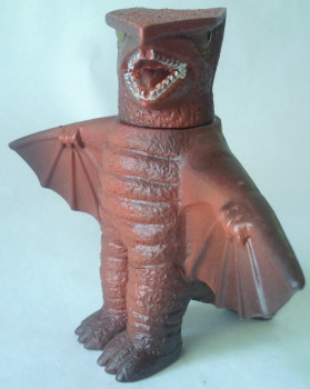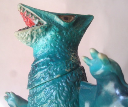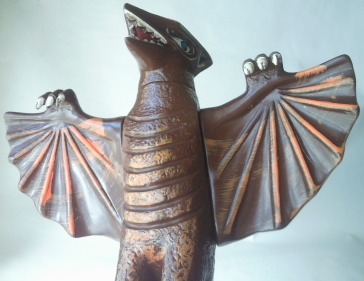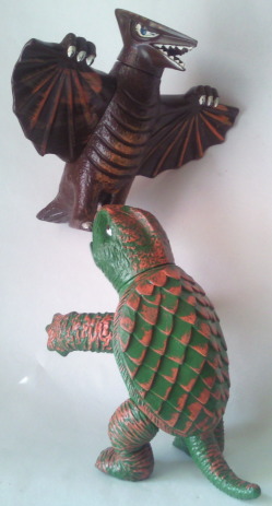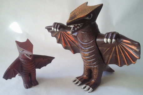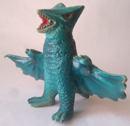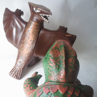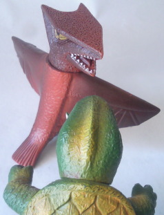 | 変わってこちらは、マルサン製。全長約13センチ。 日東科学教材製のギャオス人形たちよりも 時期的には少し前、 昭和40年代の前半に発売されていた商品で、 以前、第34回「幸せの青い鳥(ギャオス)」でも紹介した、 僕の大好きなソフビです。 もう、理屈抜きで素晴らしい。 やっぱ、マルサンのソフビはいいなぁ・・・、 って、しみじみ唸らせてくれる名品のひとつ、と言えるでしょう。 |
