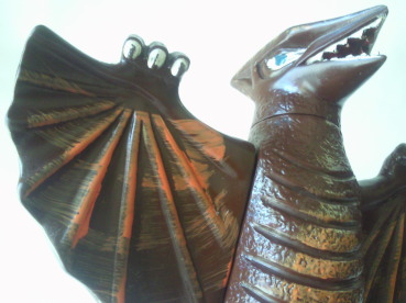 | あの名場面、 紫外線を浴びると細胞組織が破壊されて肉体が縮小する、 という弱点を持つギャオスは、 昇ってきた朝陽に反応して頭頂部が赤く発光(弱ってきた証)しますが、 もう、そうやって、 映画の中のギャオスを実感しちゃってる僕には、 このソフビの、 胴体や翼と同じ色(オレンジ色)でしか塗装されていない頭頂部ですら、 映画の中と同様、赤く輝いて見えてます。 |