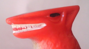 | ミニサイズ、全長約8センチ。 頭頂部どころか全身が赤で成形され、もう、瀕死状態(笑)。 そのせいか、 黒の横棒1本で描かれた目も、 力尽きて静かに閉じていくところのように思えてしまいます。 |