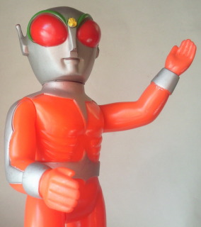 | 仮面ライダーⅤ3 全長約10センチ。 こちらは、 更にそこから5年ほど過ぎた頃(つまり、今から20年ほど前)に購入したもの。 メーカーは不明ですが、 なかなかカッコいい造形です。 |
