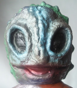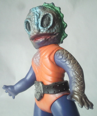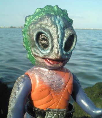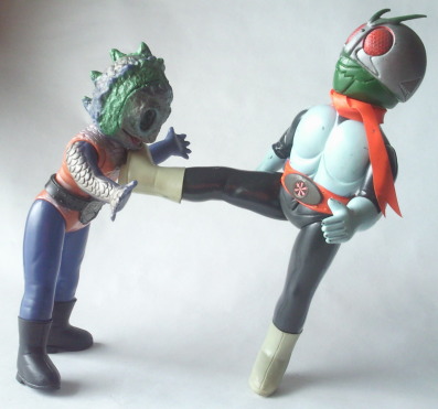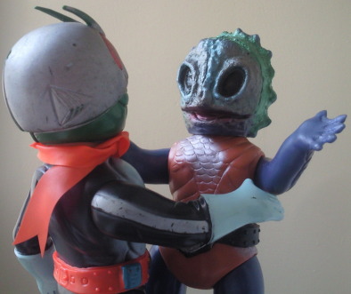 ・・・笑っております。 しかも、 不気味に、ではなく、こんなにもあどけなく、友好的に。 人間を海中へ引きずり込む凶悪な半魚人なのですが、 そんな身の毛もよだつ恐怖や嫌悪は、この笑顔からは微塵も感じられません。 凶悪な半魚人というよりは “となりのたまげ太くん” って感じで(笑)、 ライダー人形と闘わせてみても、 なんだかじゃれ合ってるように見えてしまいます。 |