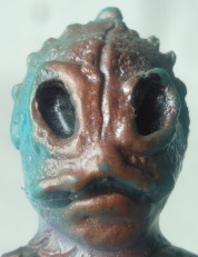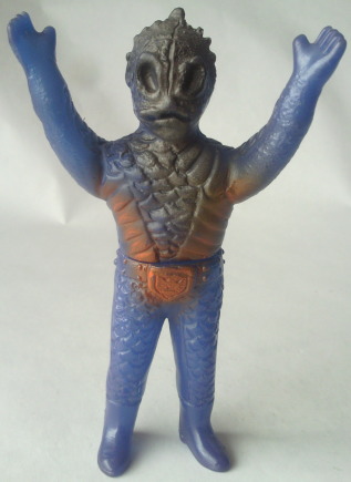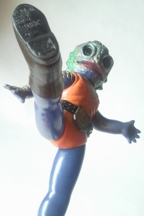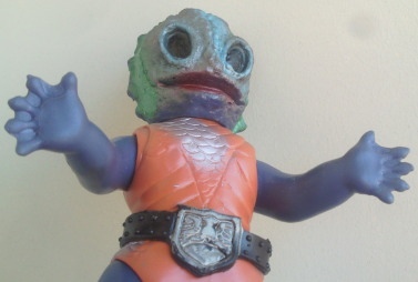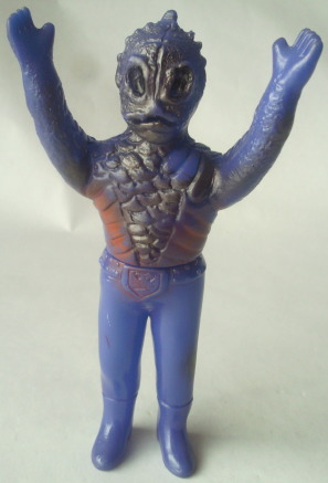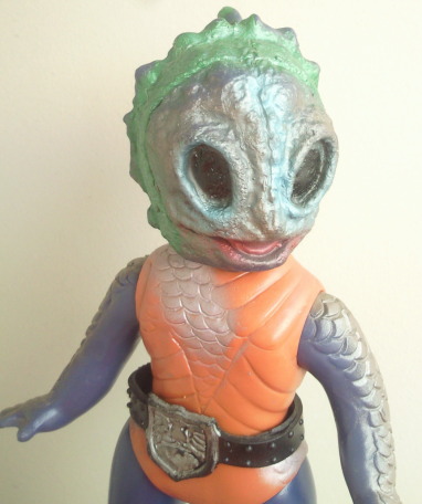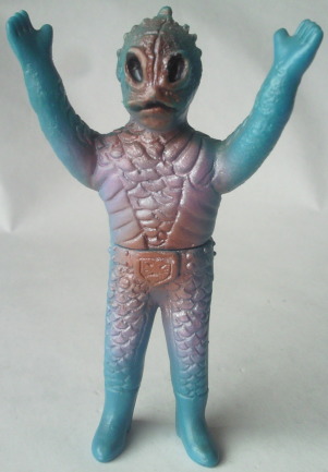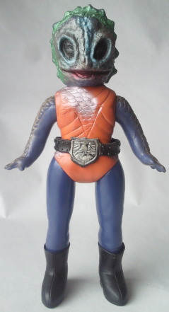 | 昭和のソフビですから、 たとえ悪者の醜い怪人の人形でも可愛らしくアレンジ、 ってのが 元々常識としてあったンでしょうけど、 半魚人なんて、いつにも増して気色悪い怪人なので、 原型師の方が意識して、 ほかの怪人人形よりも多めに “愛嬌” を盛ったのではないでしょうか。 大人になった今見ると、 もうちょっと怖くしてくれた方が ショッカー怪人っぽくてカッコいいような気もしますが、 以前、第134回「食べ物の好き嫌いは一切無し」の中で紹介した蝙蝠男人形と同様に、 実物の怪人の顔が怖すぎる分、 これくらい大胆にデフォルメして、ちょうど良かったのかもしれません。 |