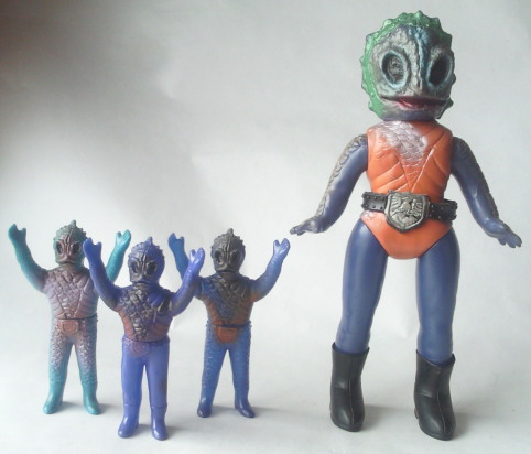 | ミニサイズは、ポピーから発売されていました(全長約12センチ)。 ただし、 向かって右端の人形の、鱗のモールドが無い下半身は、 バンダイがいろんなミニ怪人人形に流用していたもので、 足の裏には “バンダイ” と彫られています(よって人形はポピー製でなくバンダイ製か・・・?)。 第153回「蘇らずとも、甦る」で紹介したヒトデンジャーのミニソフビと、同じですね。 当時のショッカー怪人のミニソフビは、こういうのが当たり前でした。 爆発的な人気キャラクターであった事と、駄菓子屋でも売られていた安価な玩具ゆえ、 作ったそばから売れていく大ヒット商品でしたからね。 面倒くさいから、みんな、同じ下半身、付けとけ、 とか、 間違えて、違う怪人の下半身、付けちゃった、 とか、 そんな “ノリ” だったのではないか、と思われます。 同じ妖怪でも、 “アマビコ” と “アマビエ” の、2種類の違った記録があるように、 同じアマゾニアのミニソフビでも、 “鱗有り” と “鱗無し” の、2種類の違った下半身がある、というわけです(笑)。 |