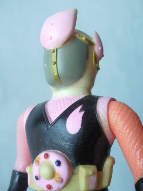 顔が、こんな “のっぺらぼう” みたいになっている理由は、 被ってる仮面の、 スモークフィルムの開閉シールドを、下げた状態(戦闘態勢)で人形化されているから。 顔が見えない状態なわけですから、 初代花忍としても、2代目花忍としても、遊べますね。 ・・・まぁ、 昭和のオモチャですから、 シールドを上げた状態で顔が描かれたところで、 初代か2代目かは、判別不可能だったと思いますが・・・(笑)。 |
