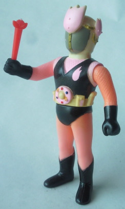 花忍キャプター3 ポピー製、全長約13センチ。 昭和50年代初頭に放送されていた『忍者キャプター』に登場する、 7人組主人公の中の紅一点。 ミニサイズなので、 額についている花のマークの大きさが、 ちょうど、 今朝、露天風呂で僕の目の前に舞い落ちた桜の花びらを思い起こさせます。 |