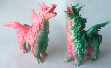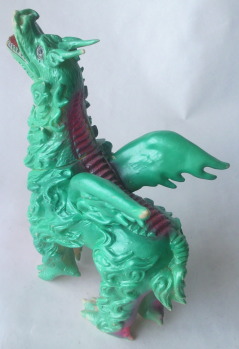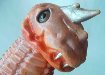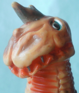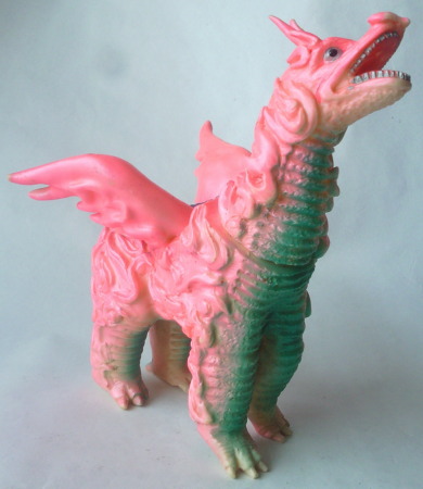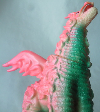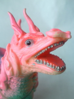 | マルサン製、全長約22センチ。 最初に紹介したドドンゴ人形と同じで、 昭和40年代初頭に売られていたソフビですが、 いくら、 オモチャの人形はデフォルメ造形が当たり前の時代で、 実物の怪獣の姿形や色を忠実に再現する概念が無かった、 とはいえ、 劇中、 赤い色の怪獣バニラと闘う青い色の怪獣アボラスを、 ピンクの人形(つまり赤い人形)にしちゃう、っていう暴挙(笑)には、 絶句してしまいますね。 15年前の第17回「桃色の宴」の最後でも述べてますが、 幼い頃に、近所のオモチャ屋の店頭で、 「なんでアボラスがピンクなんだ」 と怒っている子と遭遇した事を憶えています。 |