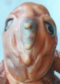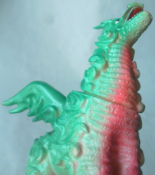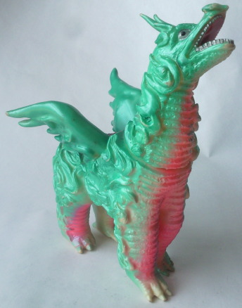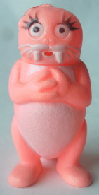 | 昭和40年代初頭に売られていたソフビです。 マルサンおよびマルサンの金型を流用したブルマァクを通して、 いろんなカラーバリエーションが存在するスタンダードサイズのドドンゴ人形ですが、 その中でも、 実物のドドンゴのイメージを一切無視したこの彩色の人形は、特筆に値します。 |