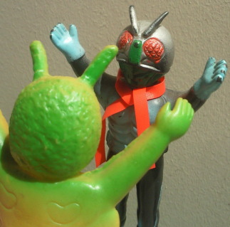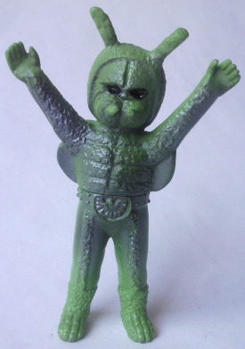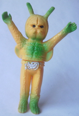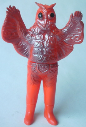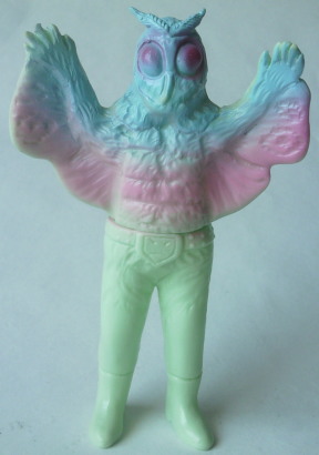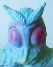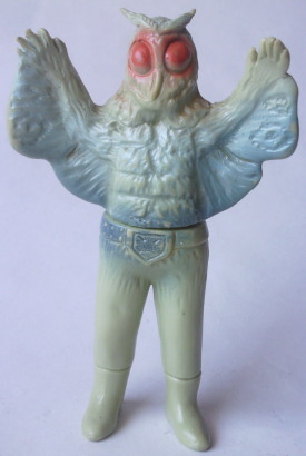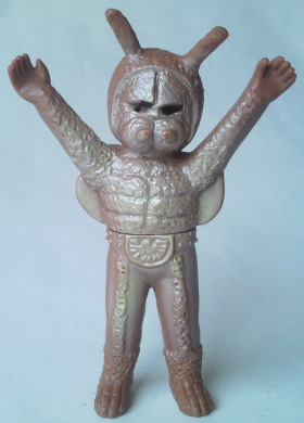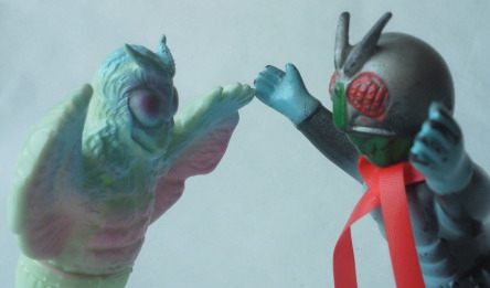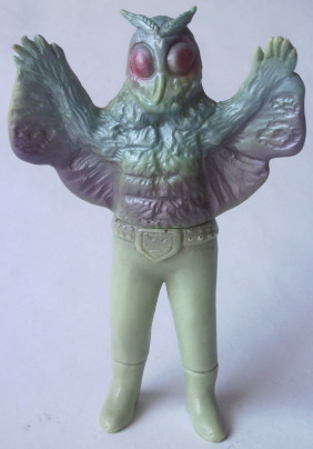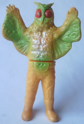| 車を運転中、信号待ちしていたら、 運転席の窓に何かがコツンと当たる音。 目を向けると、 なんと、大きな蛾が、バタバタと翅を羽ばたかせていました。 昼間でしたし、特に車内が明るかったわけでもないのに、 なぜか、 その蛾は、車内に入れてくれと言わんばかりに、窓に何度も顔面をぶつけてきました。 窓を1枚挟んで見る蛾の顔面アップに思わず鳥肌が立ち、 「気持ち悪っ・・・」 と呟いたものの、 ふと、その顔面がショッカー怪人のドグガンダーにそっくりな事に気づいて、 なんとも懐かしく、 慕わしい気持ちにもなりました(笑)。 そういえば、 7月は “ナショナル・モス・ウイーク” がある月。 モスラに人生を監視されている僕(第50回「モスラの怨念」参照)なので、 自然を愛する心、自然を大切にする心を、決して忘れるでないぞ! と、神様がこの時期に蛾を僕の前に遣わせたのかもしれません。 ・・・え? ナショナル・モス・ウイークって何、って? いやぁ、あるンですよ、そういうウイークが。 直訳すると “世界蛾週間”。 要は、愛鳥週間の “蛾” 版、ってトコでしょうか。 愛鳥週間は5月ですが、 ナショナル・モス・ウイークは、7月の下旬。 蛾という昆虫を通して、 自然の面白さや素晴らしさを再確認しよう、というウイークです。 その期間中に、 情報や知識の共有を目的として研究者や昆虫マニアが集うイベントも、 世界各国(日本を含む)で開催されているそうです。 でも、なんでまた “蛾” なの? 気色悪いじゃん! と思われるかもしれませんが、 蛾は、ものすごく種類が多く、翅の模様の美しさや不思議な生態などが、 昆虫好きな人たちからすると、たまらなく魅力的なんだとか。 そんなわけで、 今回はドクガンダーのソフビを紹介させていただきます。