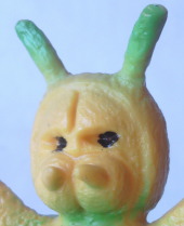 では、そんなお気に入り怪人のソフビ、まずは幼虫の人形から・・・。 3体ともすべて、ポピー製で全長約11センチ。 ただし、 真ん中と向かって右端の2体は、 左端の黄色のものより数ミリ小さいので、 メーカーの刻印ごとコピーした海賊版である可能性もあります。 そう疑ってかかると、色が異なる事も、なんだか怪しく思えてきます(笑)。 いつも言いますが、 『仮面ライダー』が放映されていた頃に生産・発売されたショッカー怪人のミニソフビは、 駄菓子屋でも売られていた廉価版商品である事や 苦労せずとも売れていくヒット商品であった事などから、メーカーの管理が不徹底です。 彩色が無責任だったり、 上半身パーツとは違う別の怪人の下半身パーツがくっつけてあったり、と もう、グチャグチャ。 加えて、 メーカーの刻印ごと丸々コピーした海賊版人形も横行した時代ゆえ、 タグの付いた袋入り新品でない限り、 どれが本物(正規品)でどれが偽物(海賊版)か、判定不可能なンですよねぇ。 ・・・まぁ、それゆえ、 バリエーションが豊富で集め甲斐があるし、 当時の時代背景や『仮面ライダー』人気の白熱ぶりが伝わってきて、面白いンですけどね。 その醍醐味・妙味は、 続いて紹介します成虫の人形で、更に強く堪能出来ます。 以前、第68回「心は “せいたかさん”」の中でも述べましたが、 カラーバリエーションが豊富なだけでなく、 異なる下半身の造形をしたものが、何種類も存在するのです(メーカーはすべてバンダイ製で、全長約11センチ)。
