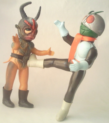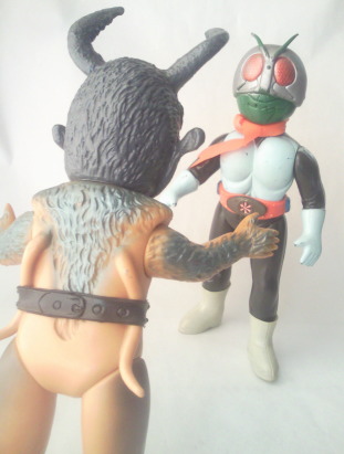 | まぁ、でも、 スタンダードサイズ人形の方も、 上の、 ライダー人形と向き合っている写真を見ればわかるように、 その長い棘が脇腹でなく背中から生えちゃってる、 っていう間違った造形なので、 どっちみち、 実物の怪人とは異なる見た目なンですけどね(笑)。 そもそも “棘” って解釈じゃないみたいだし・・・。 |
