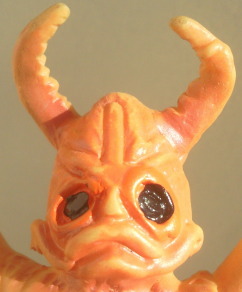 ミニサイズ人形のみポピー製で、全長約10センチ。 チープな商品ながら、 ユニークな顔の特徴もよく捉えているし、 脇腹の長い棘(短いけど(笑))も生えてて(スタンダードサイズに倣って背中からだけど(笑))、 好感の持てる造形をしています。 |