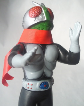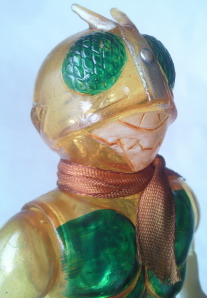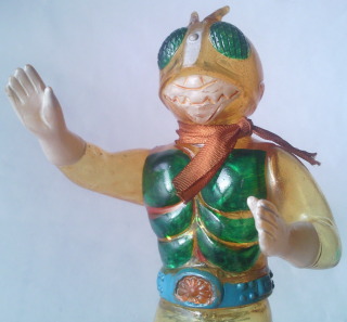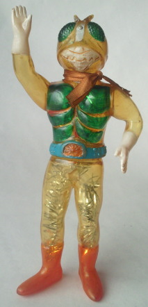 | それを、僕、軽く聞き流しちゃったンですよね。 この人形は、 メーカー名や版権元を示す刻印が一切ありませんし、 造形からして “いかにも海賊版” な商品なのですが、 『仮面ライダー』放映当時は、 こういった流通経路のよく解らない人形が多く出回っていた時代で、 メーカー名や版権元を示す刻印ごとコピーした海賊版も存在しますので、 その逆の、 メーカー名や版権元を示す刻印が無いのに、れっきとした正規品、 というものもあったかもしれない、 って事だろうな・・・、って解釈して、それ以上は詳しく聞かなかったンです。 なんたって、 目当てのソフビを探すのに必死でしたし、 それに、若かったですからね、 そういった御主人から聞ける話の大切さを、今ほど解っていなかったンです。 |
