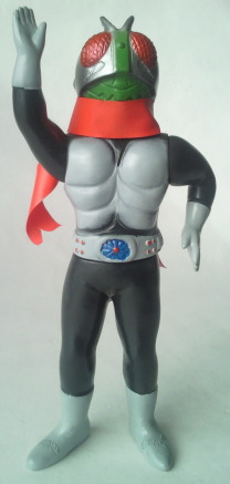 仮面ライダー メーカー不明 全長約19センチ。 今から25年ほど前、 関東方面の、2階の部屋が倉庫になっていた或る古い玩具店で見つけたもので、 タグが取れてしまった跡のある、汚いビニール袋に入ってました。 |