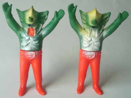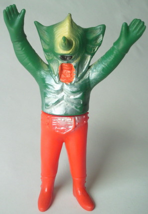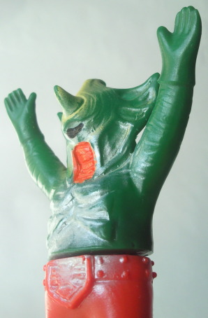 ユニコルノス ポピー製、全長約12センチ。 以前、 第153回「蘇らずとも、甦る」の中で紹介した向かって右側の人形と違い、 口の辺りが赤く塗装されています。 |