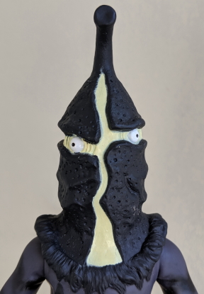 上の初版人形発売から数か月後、 600円から700円の値上げを機にヴァージョンアップ。 実物の、あの、目がぎょろぎょろ動く様を強調しようとしたのか、 目の横の皺が、 下の向かって右側の写真のように、黒く塗られました。 |