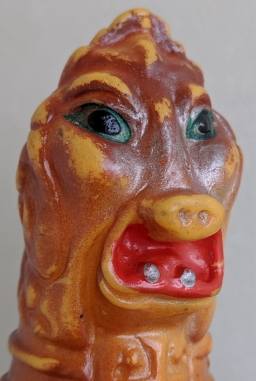 これだもんね、なんたって(笑)。 でも、この顔が、 実物のバニラを愛するのとは別の次元で、僕は大好きなンですよね。 というのも、 以前、 第20回「誰かに似たソフビ」や第45回「ソフビ怪獣人形は戦うオモチャ」の中でも述べてますが、 子供の頃に よく母親に連れて行ってもらっていたおでん屋のオバチャンの顔が、 この人形の顔にそっくりだったからなンです。 つり目で、豚鼻で、 頬骨がボコッって出てて、いつもだらしなく口を開けてて・・・。 |