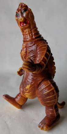 平成7年の夏、PL法の施行により、素材が軟質のソフビに変更されました。 彩色はそのまま。 全長約16センチ。 |