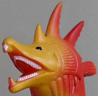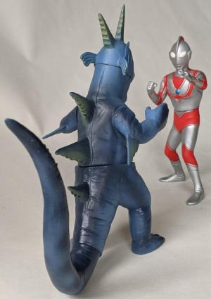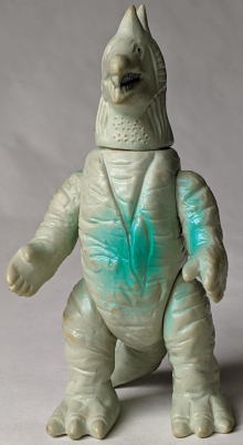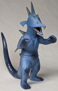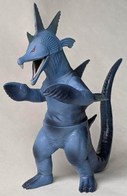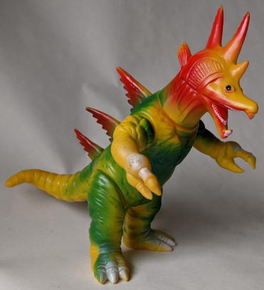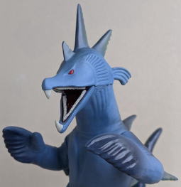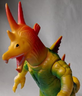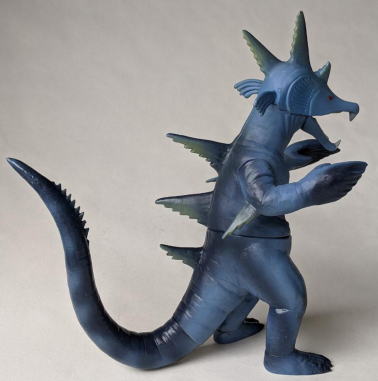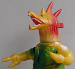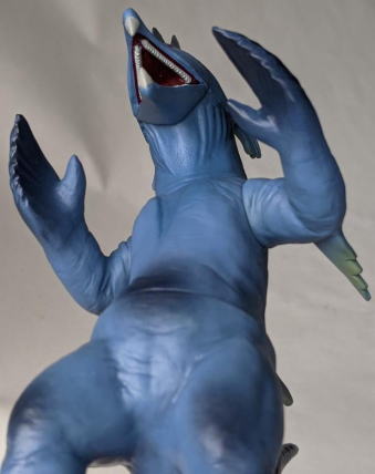 ただ、 キングマイマイは幼虫から成虫へと変態する、“虫” の怪獣ですので、 魚の怪獣から虫の手が生えてる・・・、 なんて、 なんだか、寄生虫に乗っ取られた魚みたいで食欲が失せるので、 個人的には、 僕はこのソフビ、あまり好きではありません(笑)。 ・・・まぁ、 デザイン・造形のモチーフが鮭だからといって ムルチを鮭やイクラを食すイメージで見る僕の観点が、 おかしいンでしょうけど・・・(苦笑)。 |