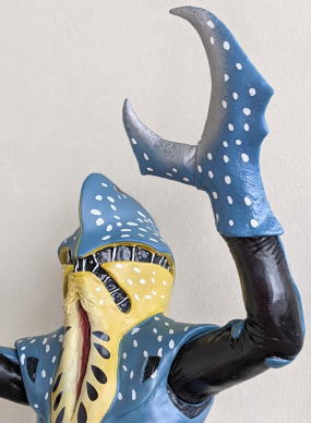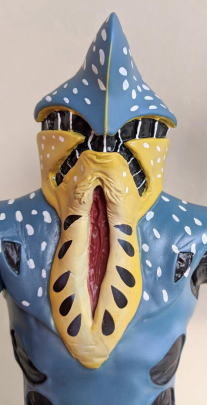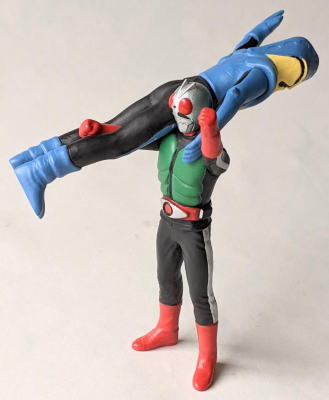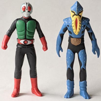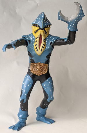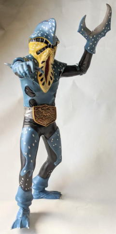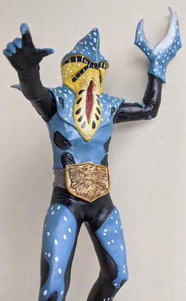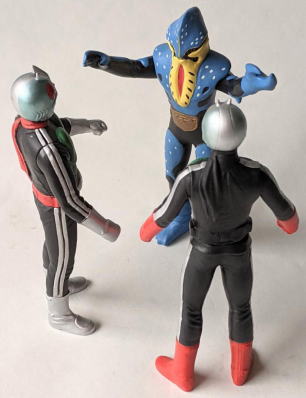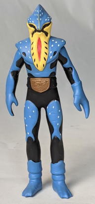 やはり、 水の中に棲む生き物を飼育・観賞するのは、良いですね。 楽しいし、面白いし、 特にこの季節は、 気持ちを涼しくしてくれて、 暑さをしのぐのに一役買ってくれますから、ありがたいですし・・・。 今年の夏も、 これでもかっ! ってくらいの猛暑で、 暑さで目がくらむような毎日がまだまだ続くようですが、 彼らのおかげもあって、なんとか無事、明るく元気に乗り超えられそうです。 ・・・というわけで、 毎度おなじみソフビコレクションの紹介ですが、 今回は、 ヨシノボリの怪獣を・・・、 と行きたいところなのですが、いないンですよねぇ、そんなの(苦笑)。 せめてハゼドンのソフビでも持っていればなぁ・・・。 キャラクター玩具のマニアやコレクターの方なら御存知でしょうけど、 ありますよねぇ、 ハゼドンとシーランとプーヤンの、 番組放映時のめちゃくちゃ可愛いソフビ・・・。 過去に2、3回、 アンティーク・トイ・ショップや即売会の会場で見かけた事があります。 あれが今手元にあれば良かったのですが、 アニメキャラクターのソフビはコレクションの対象外ゆえ、持ってないンですよねぇ、僕。 持ってたら、紹介出来るのに・・・。スミマセン。 1回だけとはいえ、 子供の頃にリアルタイムで観た番組の、 一応ですが、思い出も思い入れもあるキャラクターなのだし、 良さや魅力だって解かるし、 なんたってソフビコレクターなンですから、 本来なら、見かけた時に迷わず買って所有してなきゃ、おかしいンですけどね(苦笑)。 ホント、スミマセン。 仕方がないので、今回は、 さきほど、ハゼ科の魚の特徴を説明する際に、 ムツゴロウの喧嘩相手として名前を出した、 シオマネキ(・・・そう、片方の鋏脚だけが大きい、あのカニです)、 そのシオマネキの怪人が、 『仮面ライダー』に登場したショッカー怪人の中にいますので、そのソフビ人形を紹介して、 お茶を濁す事にします(・・・はっきり言っちゃった(苦笑))。