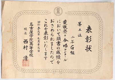 その合唱コンクール第5位の表彰状と、