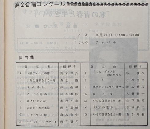 文化祭の冊子の合唱コンクールの頁。