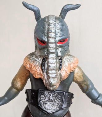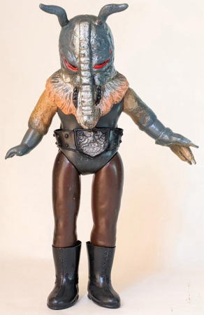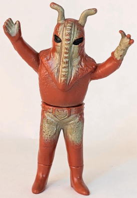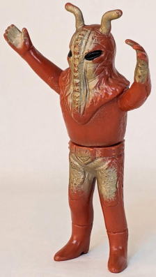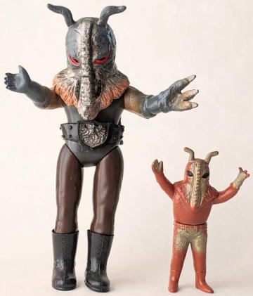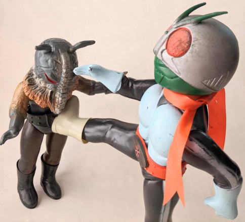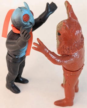 ・・・ただ、 そういう、残念さが、 実は “醍醐味”、つまり “堪らない魅力” だったりするところが、昭和ソフビの面白いところ、なンですよね。 実物の怪獣・怪人をそっくりそのまま完璧にコピーしていないところに、 夢が隠れている、というか、楽しみが潜んでいる、というか、ちょうど俳句の行間のような “想像する余地” が、残されてるンです。 世代が違う人は、あまりピンと来ないかもしれませんが、 僕らは、そういう “造形の妙” みたいなものを、幼心に、理屈でなく感覚で理解していたンだと思うンですよね。 実際にそれらの人形で自由に夢や空想を膨らませて遊び、胸をときめかせてましたから・・・。 なので、 その、気の利かない、なんだかちょっと鈍臭い感じ、 “孫の手” の話に掛けて言うと、 “痒いところに手が届かないもどかしさ” ・・・みたいなものがある懐かしの造形が、 大人になった今、とても麗しく、そして、切ないまでに愛おしいのであります。 ・・・ソフビの奥深いところです。 ![]() |