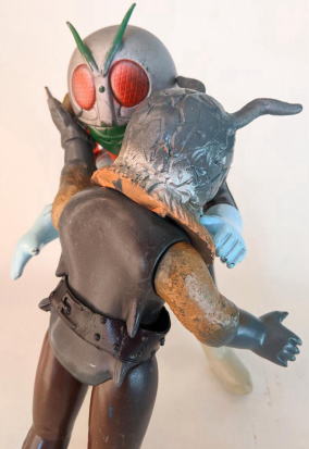 | そんな、なんだか遠慮がちな造形の鉤爪のせいで、 スタンダードサイズのアリガバリ人形もミニサイズのアリガバリ人形も、 とても、ショッカーの歴史にその名を遺す強敵怪人には見えません。 もう一度言いますが、 アリガバリの大きな左手の長い鉤爪は、 ライダーキックを跳ね返した爪、 なンですから。 それを喰らったらほとんどの怪人は絶命してしまう、あのライダーキックを、 アリガバリは、その片手の爪だけで撥ね退けたンですからね。 そんな、最も強調すべき箇所を、控えめに表現されては困ります。 |